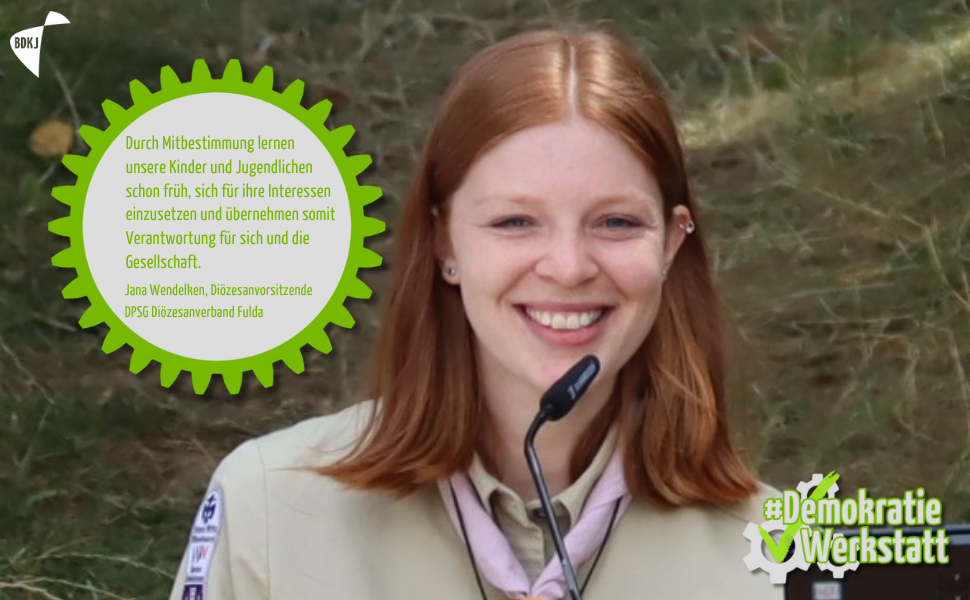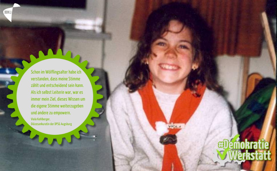 "In meinem Verband, der DPSG, durfte ich von klein auf partizipieren: Als Wölfling [mit 10 Jahren] habe ich beispielsweise als Delegierte meiner Meute [Gruppe] gemeinsam mit anderen Kindern mitbestimmt, wie unser Diözesanwölflingslager „Inuit“ gestaltet sein soll. Sowohl in den Gruppenstunden, als auch in den Stammesversammlungen, wurde ich gehört und ernst genommen. Schon im Wölflingsalter habe ich verstanden, dass meine Stimme zählt und beispielsweise bei der Wahl des Stammesvorstands entscheidend sein kann. Kindermitbestimmung ist richtig und wichtig. Als ich selbst Leiterin war, war es immer mein Ziel, dieses Wissen um ihre eigene Stimme weiterzugeben und sie zu empowern."