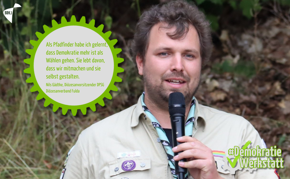 „Als Pfadfinder habe ich gelernt, dass Demokratie mehr ist als Wählen gehen. Sie lebt davon, dass wir mitmachen und sie selbst gestalten.“ – Nils Gädtke, Diözesanvorsitzender DPSG Diözesanverband Fulda