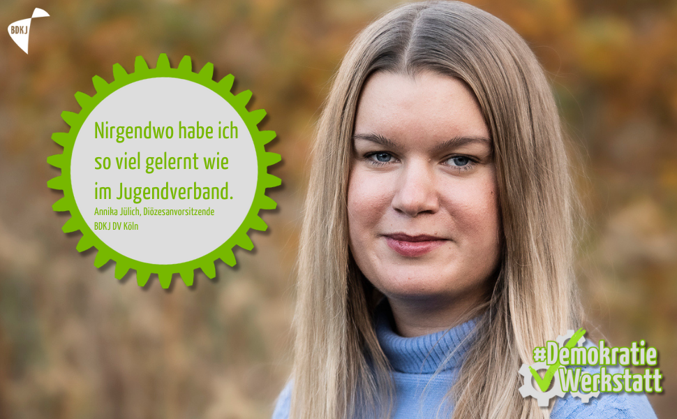 „Als ich neun Jahre alt war, habe ich die Erfahrung gemacht, bei der Pfarrgemeinderatswahl nicht wählen zu dürfen. Mit ein paar anderen Kindern haben wir schnell Plakate gebastelt und einen kurzen Demonstrationszug durchs Pfarrheim veranstaltet. In der Woche darauf haben mich meine Eltern bei der KjG angemeldet. Im Jugendverband habe ich seitdem gelernt, dass es einen Unterschied ausmacht, ob ich meine Meinung sage oder nicht. Das ist viele verschiedene Möglichkeiten gibt, Gesellschaft zu gestalten und unser Zusammenleben positiv zu beeinflussen. Und vor allen Dingen: ich habe die Erfahrung gemacht, dass mir genau das auch zugetraut wird.“