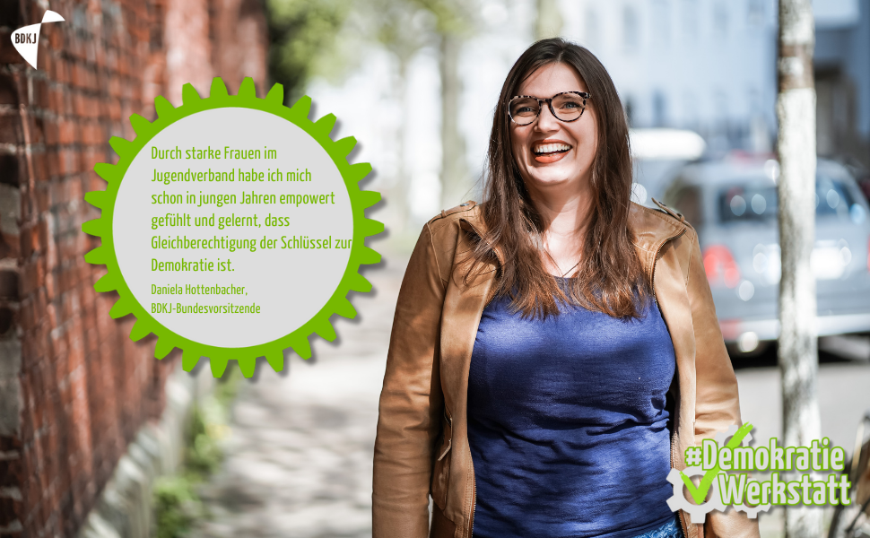 "Weil Demokratie lernen im Jugendverband heisst: Vorbilder haben, die deutlich machen, dass Verantwortung übernehmen nichts mit dem Geschlecht zu tun hat. Demokratie braucht Feminismus!"